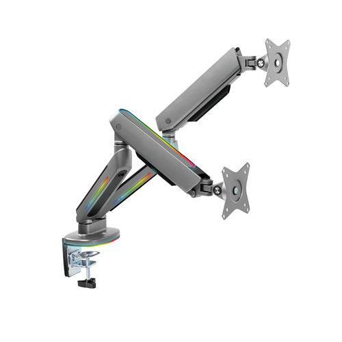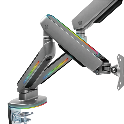 A premium dual monitor arm designed for gamers and pros alike, featuring immersive RGB lighting, smooth adjustments, and a fast-install system that enhances any gaming or productivity setup.